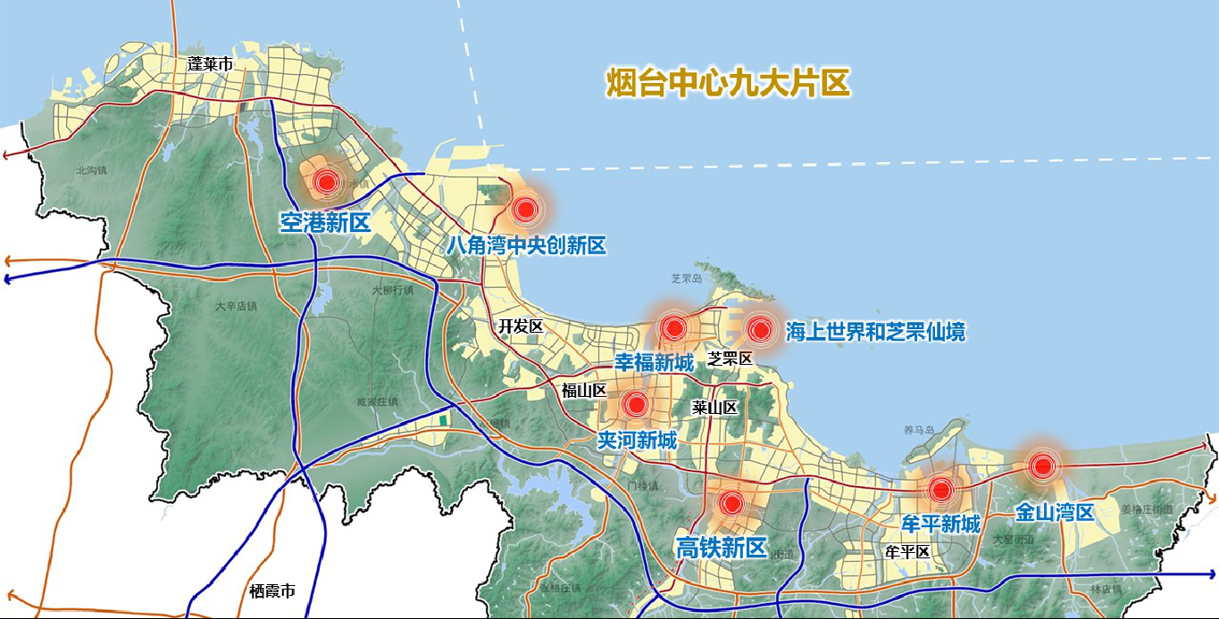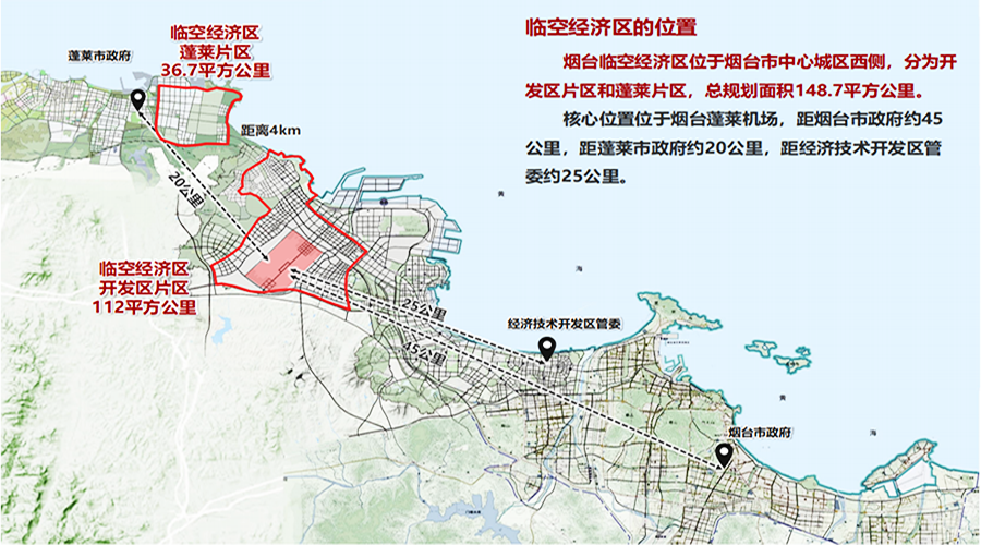 空港新区产业园依托烟台国际机场,对标国内外一流航空港区,高起点、高标准开发建设,发挥国际机场带动作用,加快打造基础设施完善、平台功能强大、新兴产业聚集、生态环境优美的现代化空港新区。产业园按照“一个核心圈、两个板块”(机场核心圈,开发区、蓬莱两大板块)的思路,总规划面积148.7平方公里。